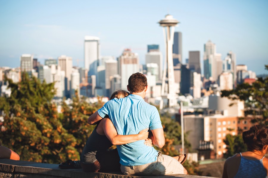 With a few hours of sunlight to spare, David suggested we shower and go grab a drink somewhere on a patio or watch the sunset since it was a nice day. I said I didn't want to spend money out so we decided on wandering up to our usual spot at Kerry Park, the gorgeous park that overlooks Seattle. Once we got to a very crowded park (there were people everywhere) we snuggled up in a little spot on the ledge, chatting and looking out at the city we call home. We chatted for a while, and then somehow I noticed that David was pulling something out of his pocket. At the time I was just thinking, "Is this really a proposal??" and I'm not even sure what was said or even if I answered the question but I heard cameras going off and people clapping. What??!! Such a surprise! Being the photographer that I am, I said, "I really hope someone got a photo!!" and David turned around and pointed at someone in a Mariner's hat, holding one of my cameras and long lenses. It was his sister and she had captured the whole thing! I was ecstatic at this point and the bottle of champagne that Laura had brought up made everything even more exciting. We spent the better part of the night on the phone and celebrating from afar with family and friends.